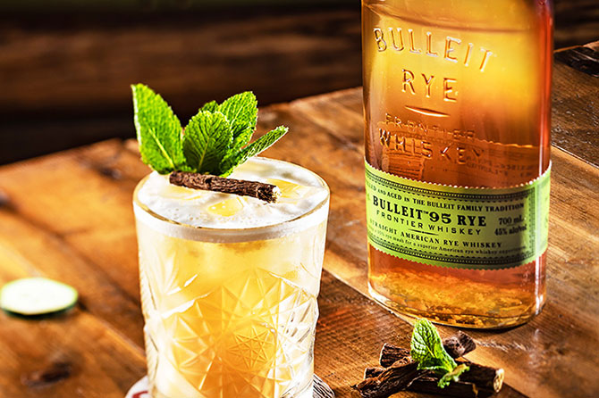 Bourbon whiskey, menta, limone e zucchero aromatizzato alla liquirizia.